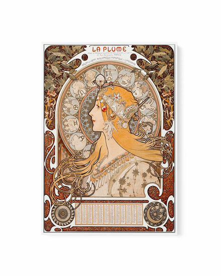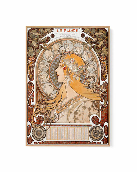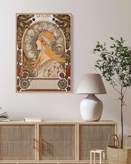 Enhance your home's decor with 'La Plume Vintage Poster', a vintage poster framed canvas print featuring an illustration of a woman blonde hair and a headress and with colourful orange and red hues by Alphonse Maria Mucha. Whether it's for your living room, dining room, kitchen, bar or office, this high-quality artwork is the perfect way to inject some retro charm into your home.